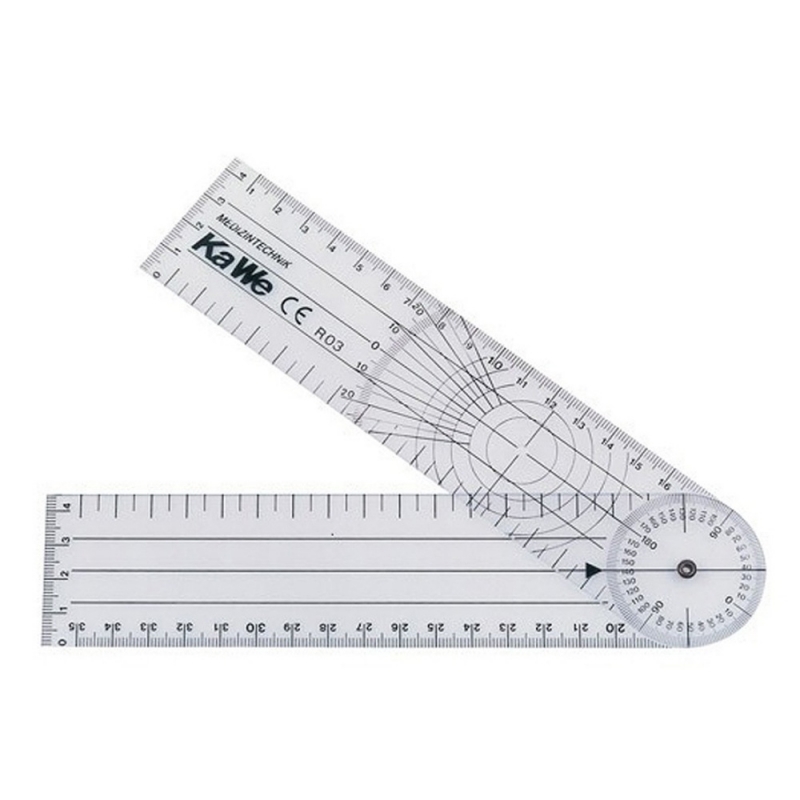 Przezroczysty goniometr z pamięcią pomiaru pomaga ocenić zakres ruchu różnych segmentów ciała w stopniach. Samohamowny charakter ramion pozwala na późniejszy odczyt pomiaru. Wykonany z elastycznego materiału.
