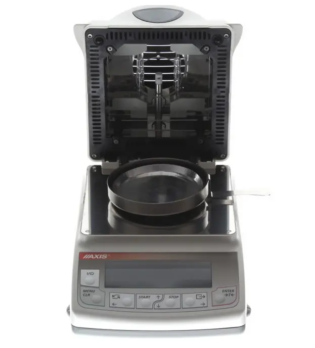 Wagosuszarki serii ATS służą do szybkiego i precyzyjnego wyznaczania wilgotności próbki materiału. Waga stanowiąca integralną część wagosuszarki umożliwia pomiar ubytku masy próbki materiału umieszczonej w komorze suszenia. Promienniki halogenowe zapewniają efektywne suszenie próbki.