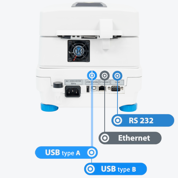 Wykorzystanie interfejsu USB umożliwia szybkie przenoszenie i kopiowanie wyników pracy (pomiary, raporty, bazy danych) do komputera lub innej wagosuszarki. Zarządzanie danymi jest również możliwe w trybie on-line, poprzez zdalny dostęp do wagi i jej bazy danych. Współpraca z komputerowym systemem E2R umożliwia zewnętrzne zarządzanie danymi, podnosząc do maksimum efekty i wydajność pracy.